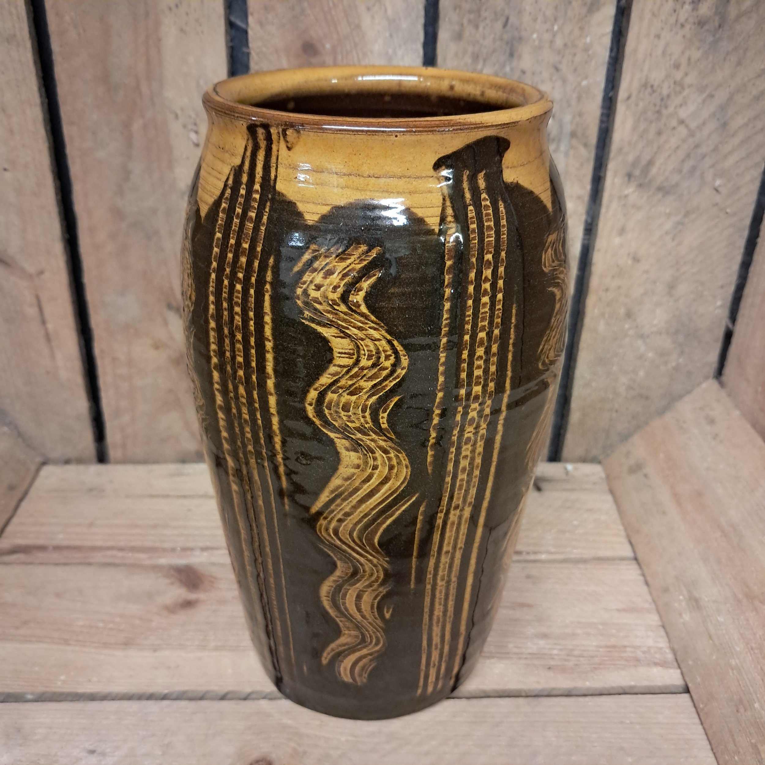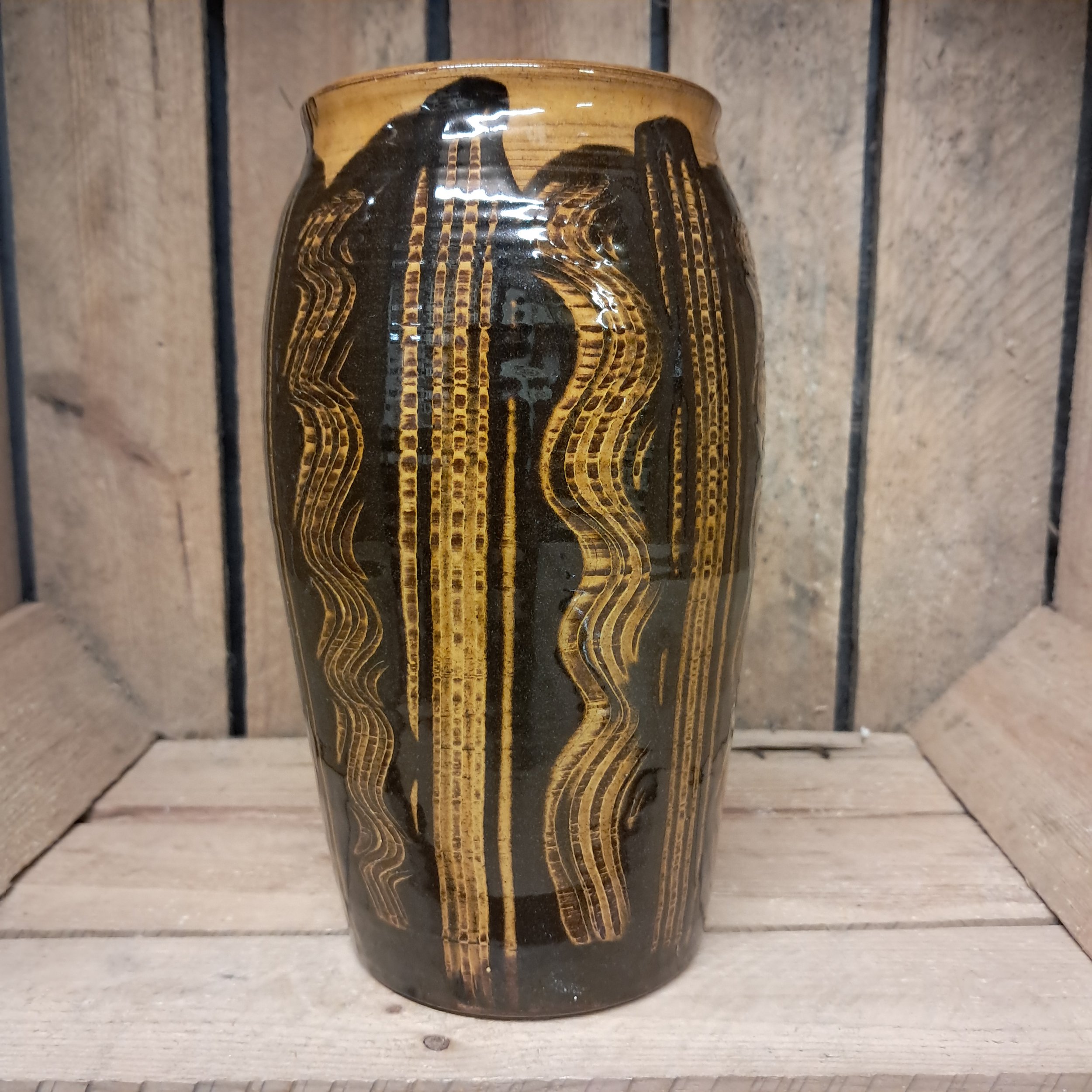 Image 1 of 2 Image 2 of 2 Vase - 20cm tall. £60.00 Vase - 20cm tall.Combed decoration in black and amber. Add To Cart Added! Vase - 20cm tall.Combed decoration in black and amber.
