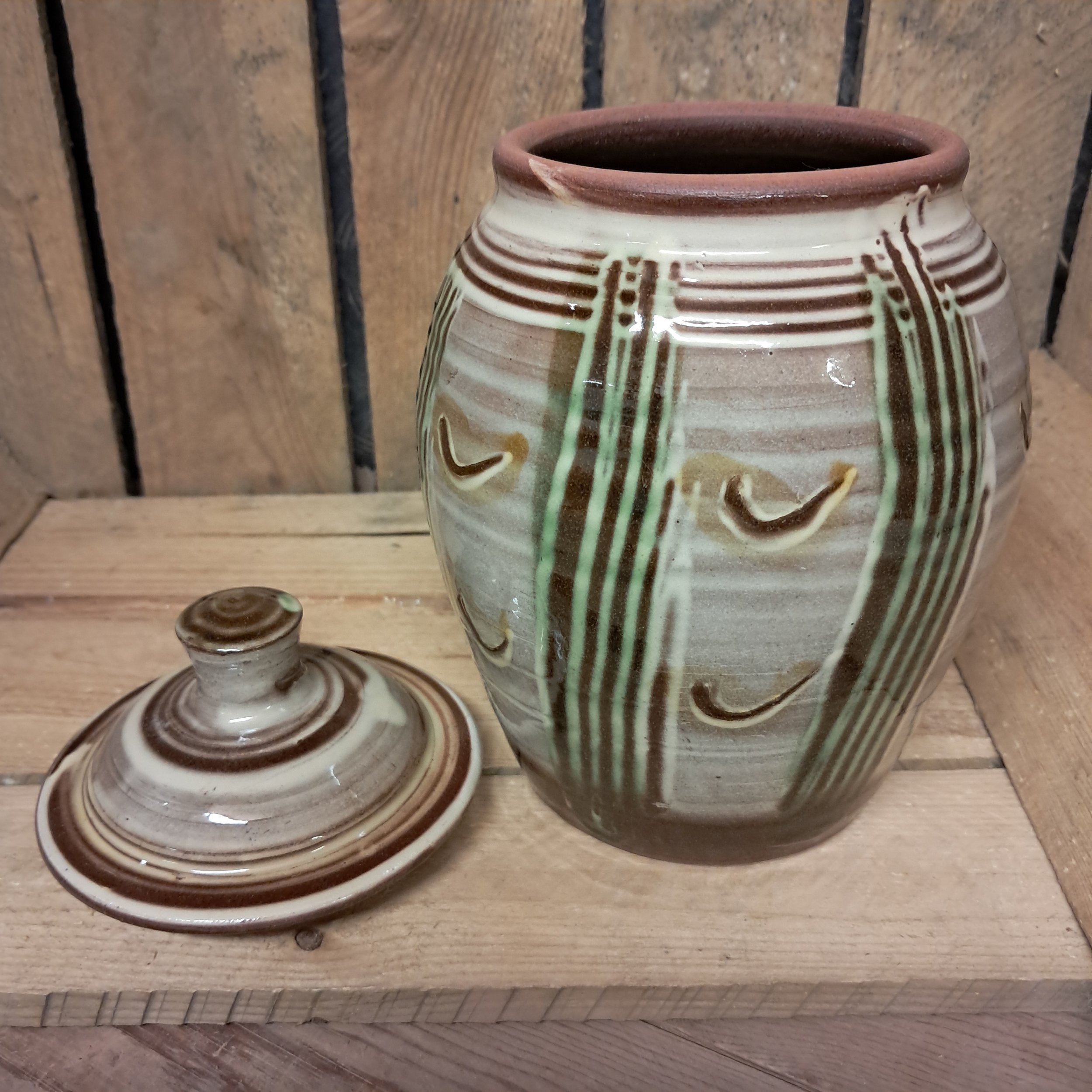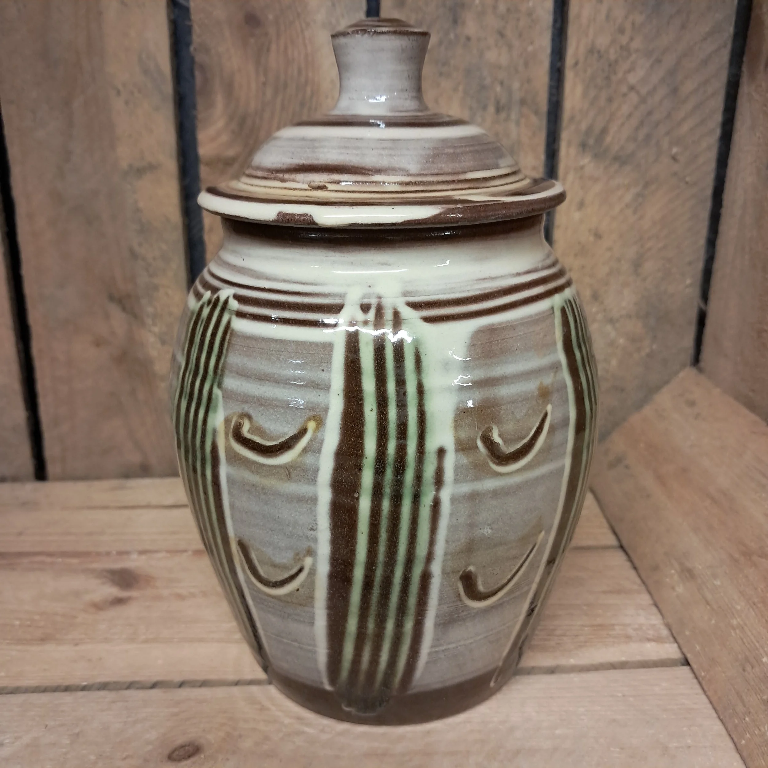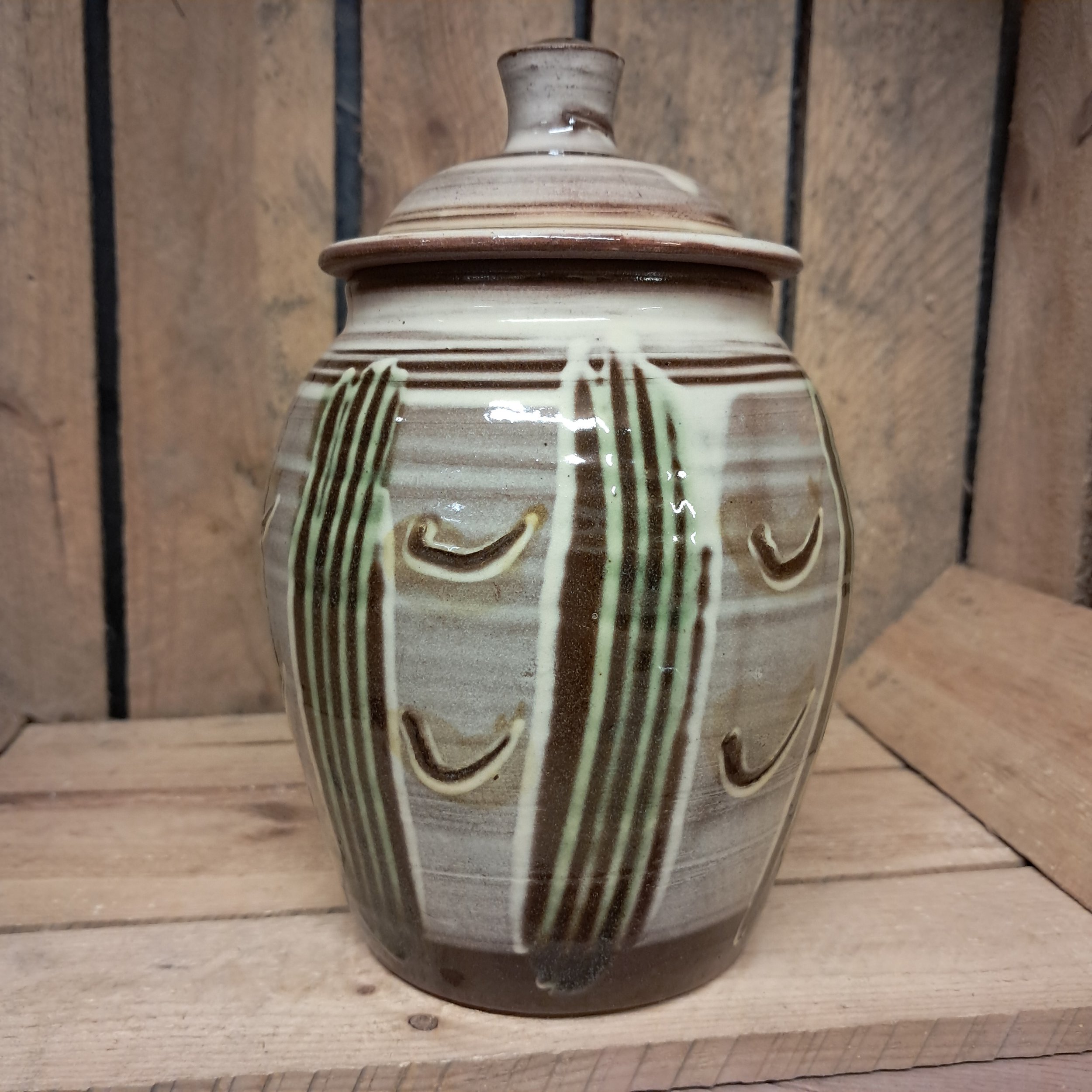 Image 1 of 3 Image 2 of 3 Image 3 of 3 Lidded Jar - 19cm tall. £75.00 Lidded Jar - 19cm tall including lid.Combed decoration in cream and green. Add To Cart Added! Lidded Jar - 19cm tall including lid.Combed decoration in cream and green.