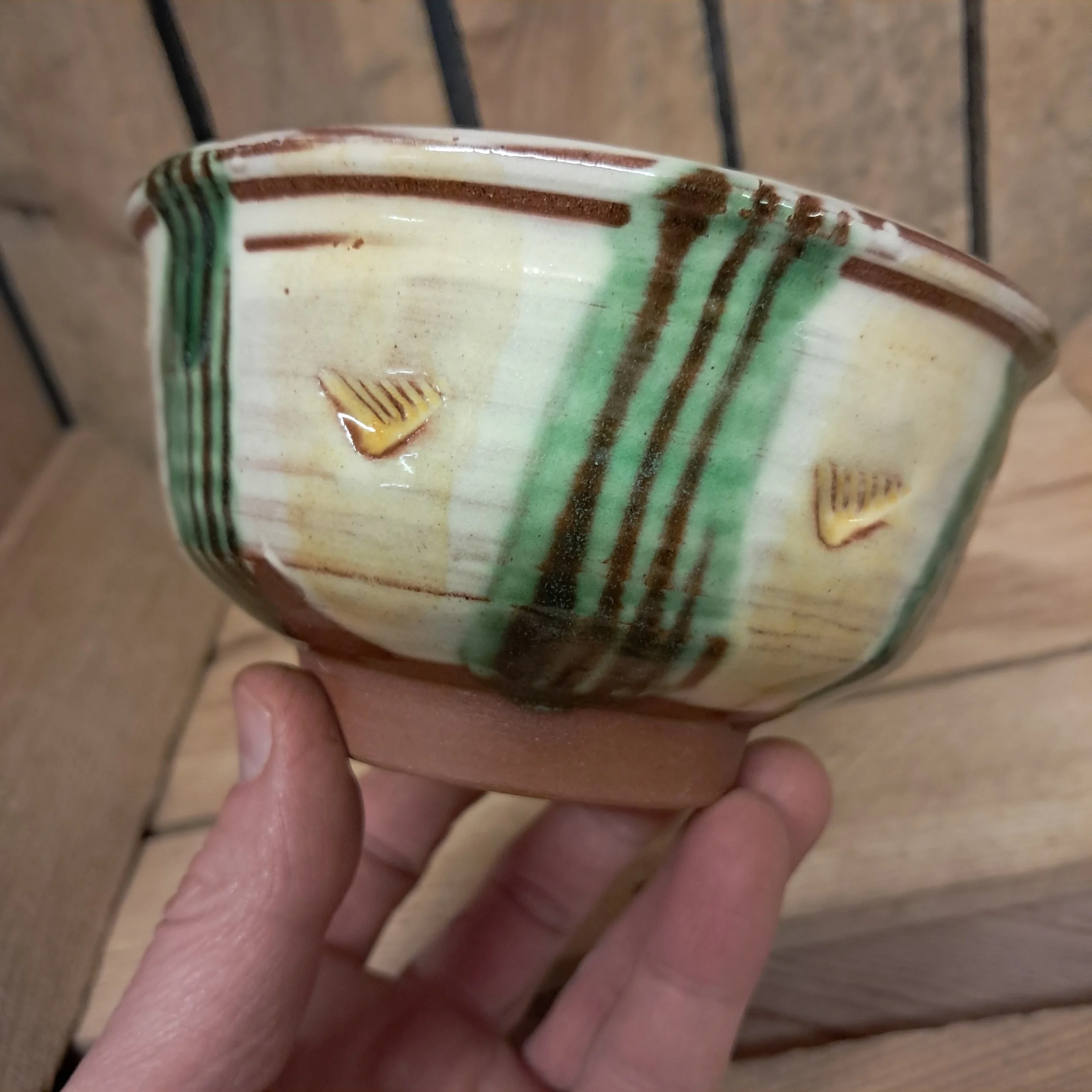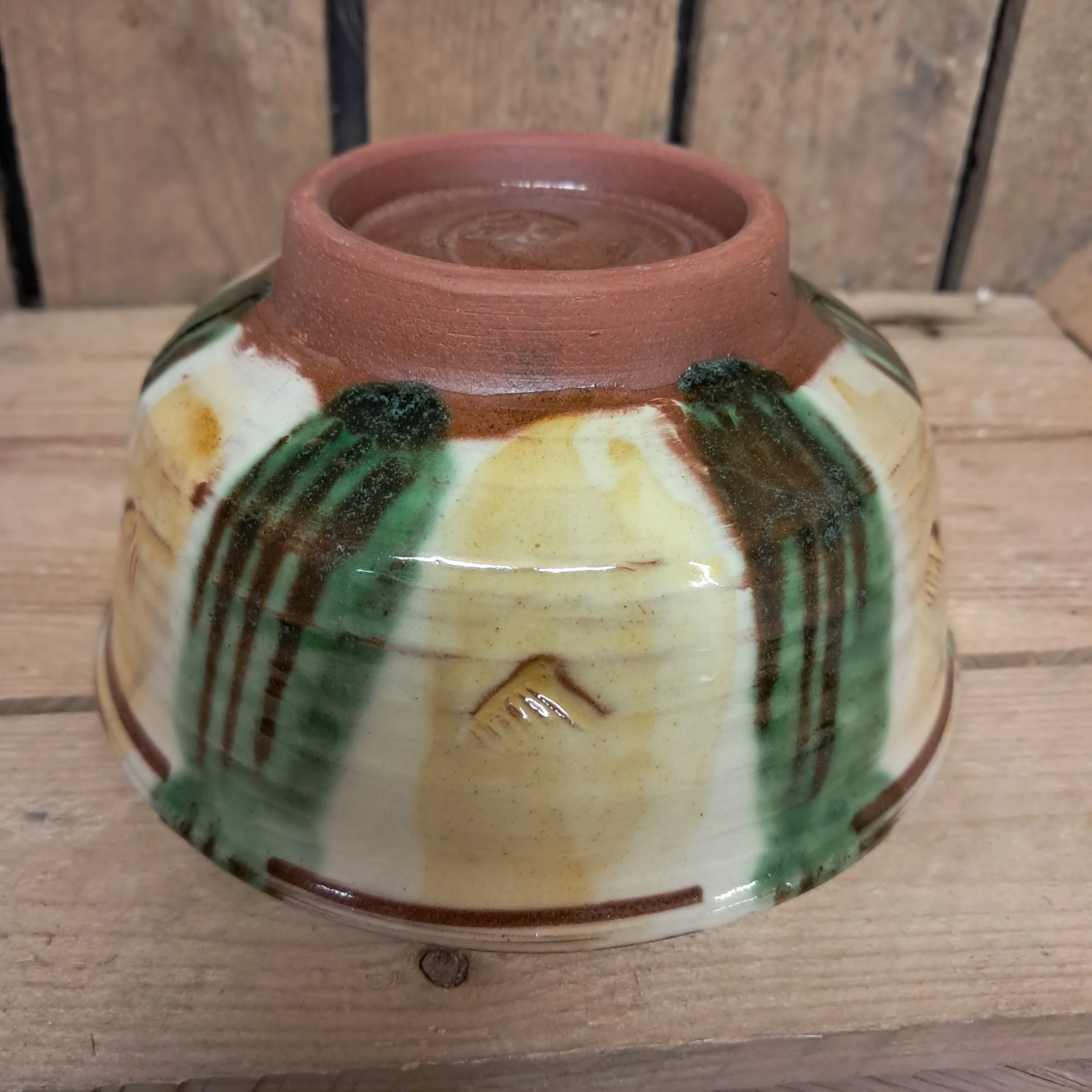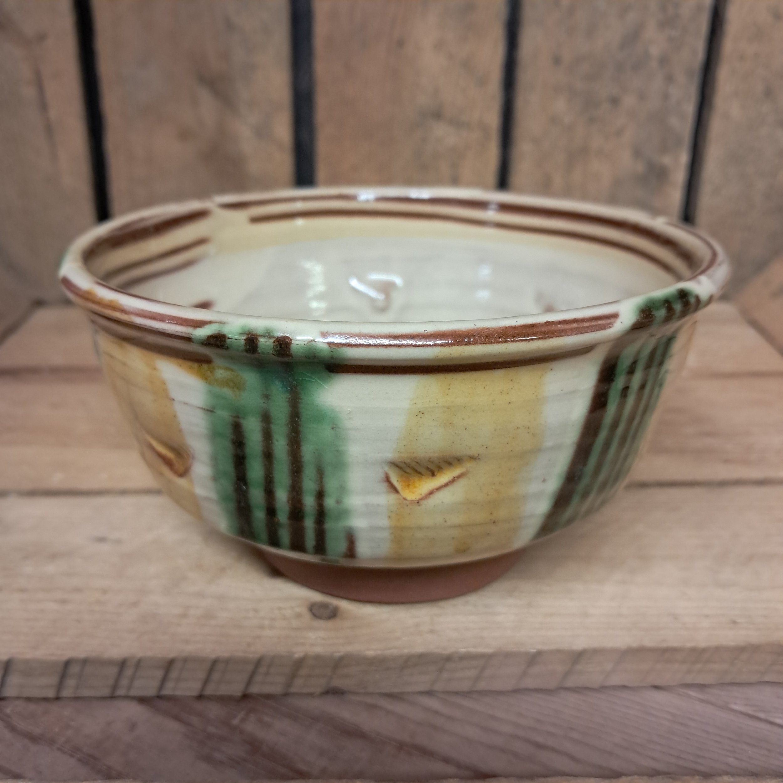 Image 1 of 3 Image 2 of 3 Image 3 of 3 Teabowl - 13cm. £55.00 Small open teabowl - 13cm x 7cm Combed and stamped decoration in cream, green and amber. Add To Cart Added! Small open teabowl - 13cm x 7cm Combed and stamped decoration in cream, green and amber.