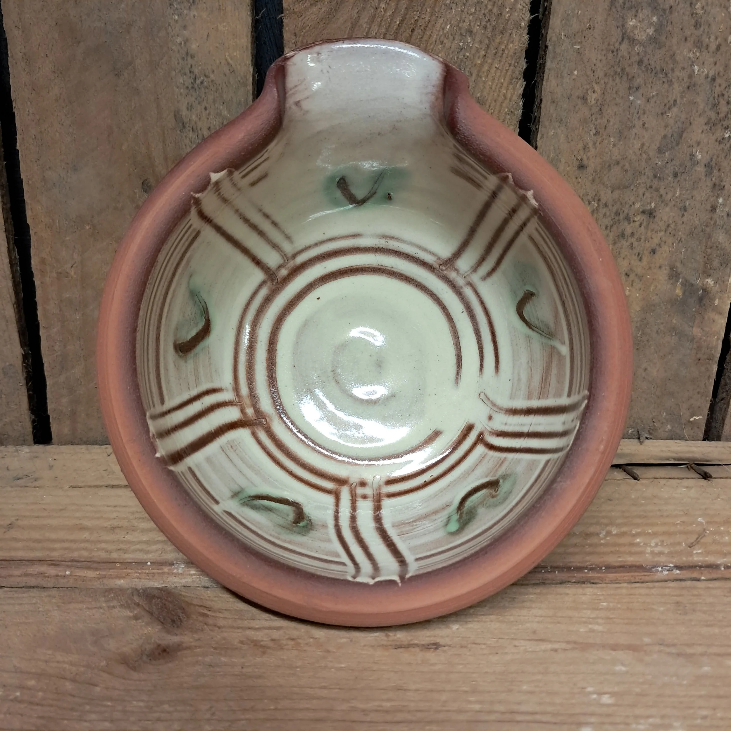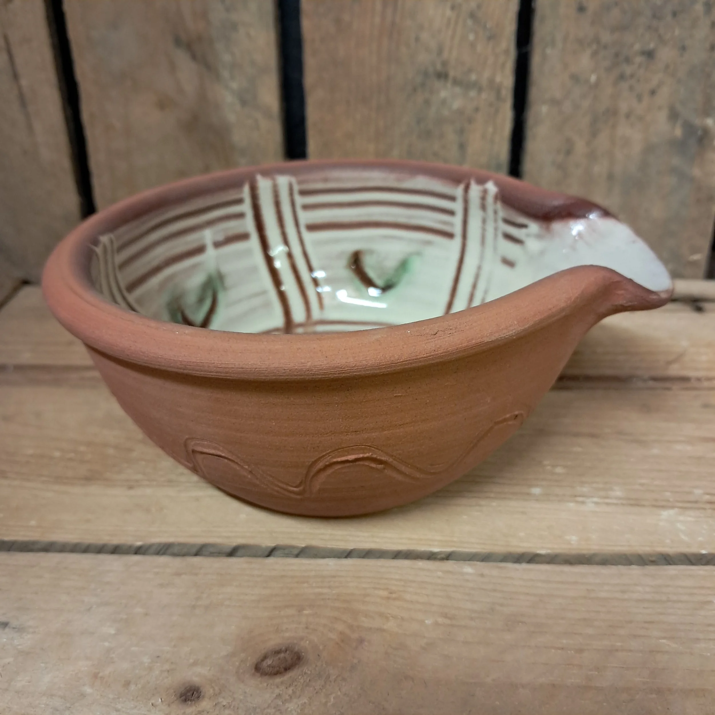 Image 1 of 3 Image 2 of 3 Image 3 of 3 Small Pouring Bowl - 12cm x 5cm. £25.00 Small pouring bowl - 12cm x 5cm.Glazed inside with a combed decoration in cream and green glazes. Add To Cart Added! Small pouring bowl - 12cm x 5cm.Glazed inside with a combed decoration in cream and green glazes.