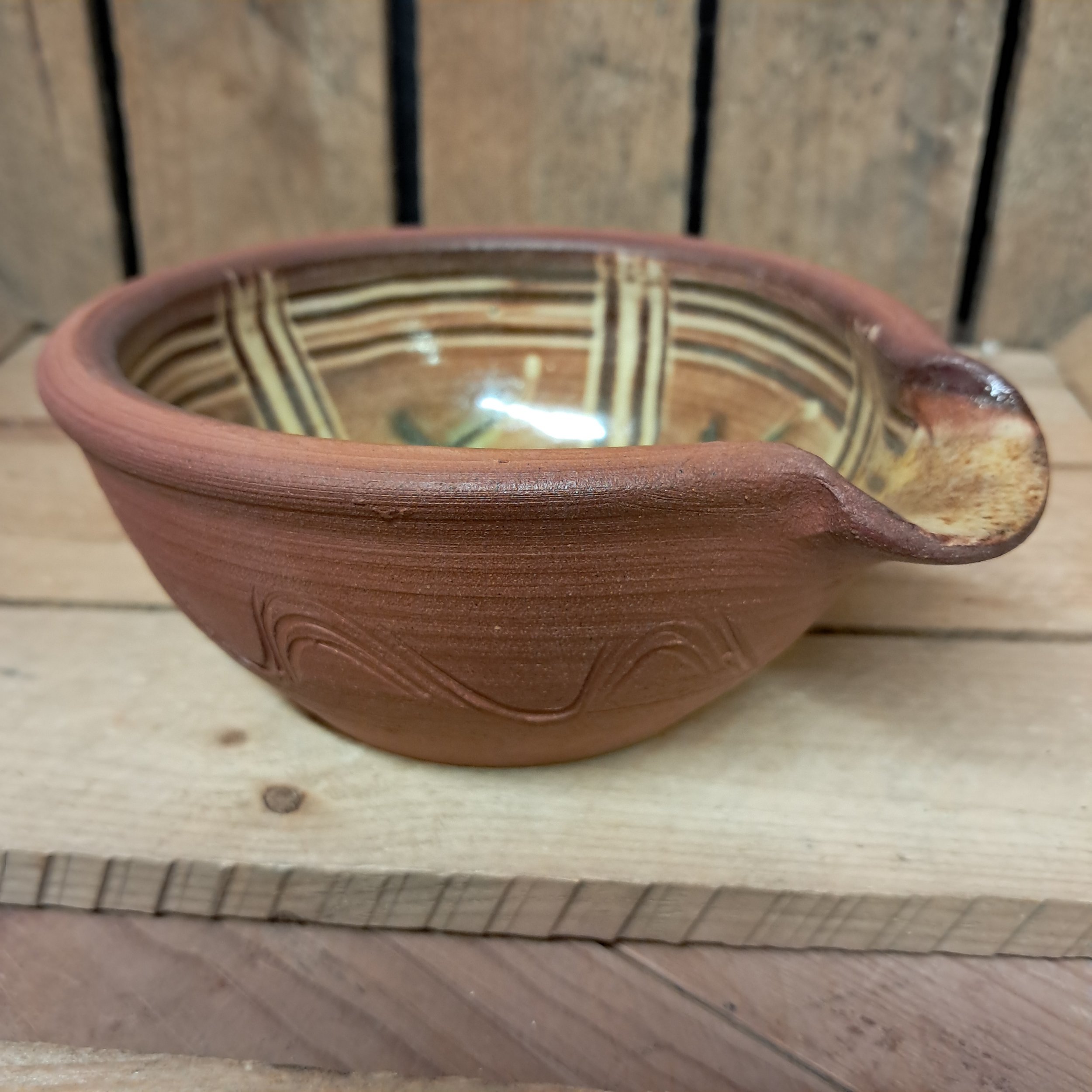 Image 1 of 3 Image 2 of 3 Image 3 of 3 Small Pouring Bowl - 12cm x 5cm. £25.00 Small Pouring Bowl - 12cm x 5cm.Glazed inside with a combed decoration in an amber glaze. Add To Cart Added! Small Pouring Bowl - 12cm x 5cm.Glazed inside with a combed decoration in an amber glaze.