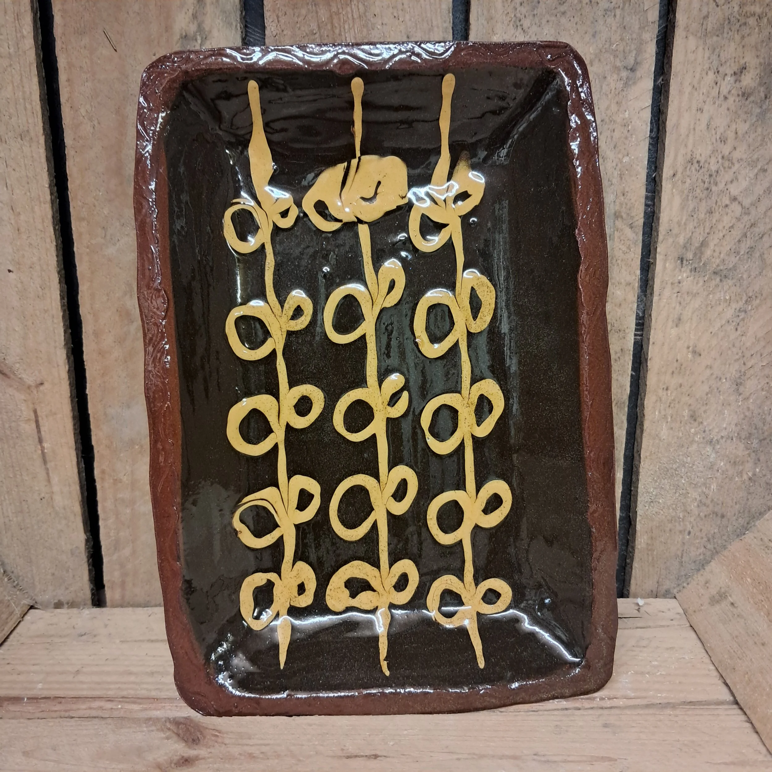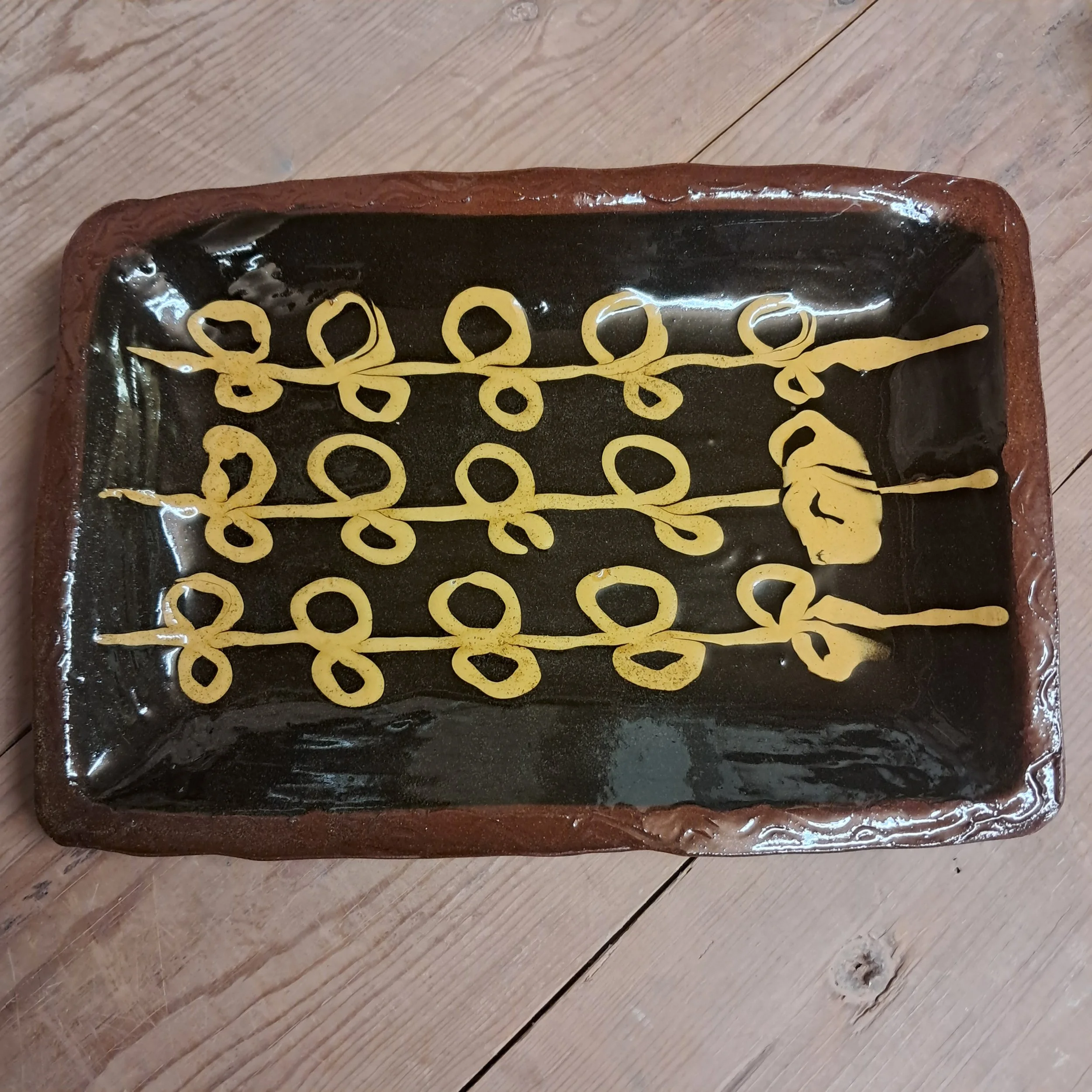 Image 1 of 3 Image 2 of 3 Image 3 of 3 Rectangular Dish - 23cm x 16cm. £35.00 Rectangular dish - 23cm x 16cm x 2.5cm.Black and amber slip trailed decoration. Add To Cart Added! Rectangular dish - 23cm x 16cm x 2.5cm.Black and amber slip trailed decoration.