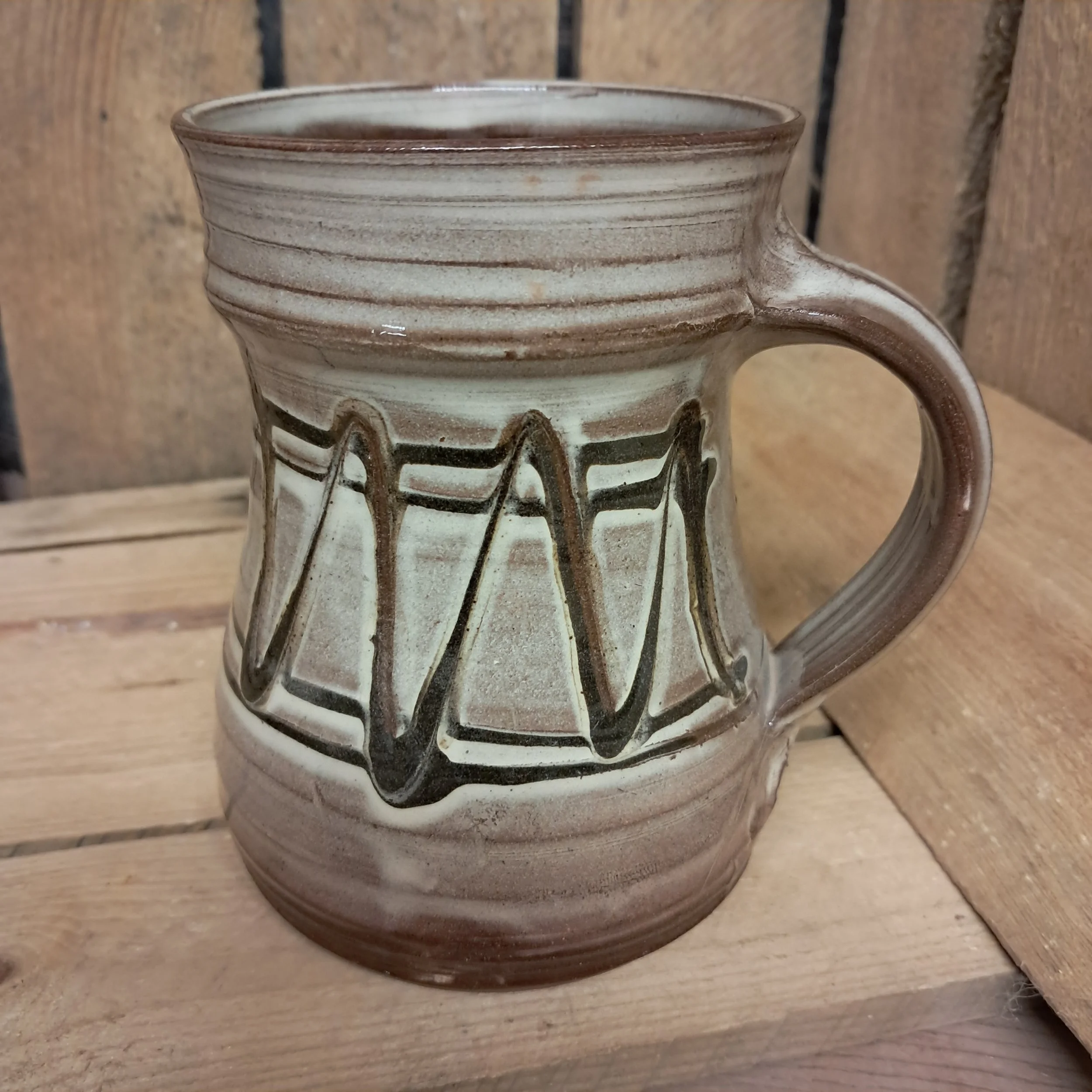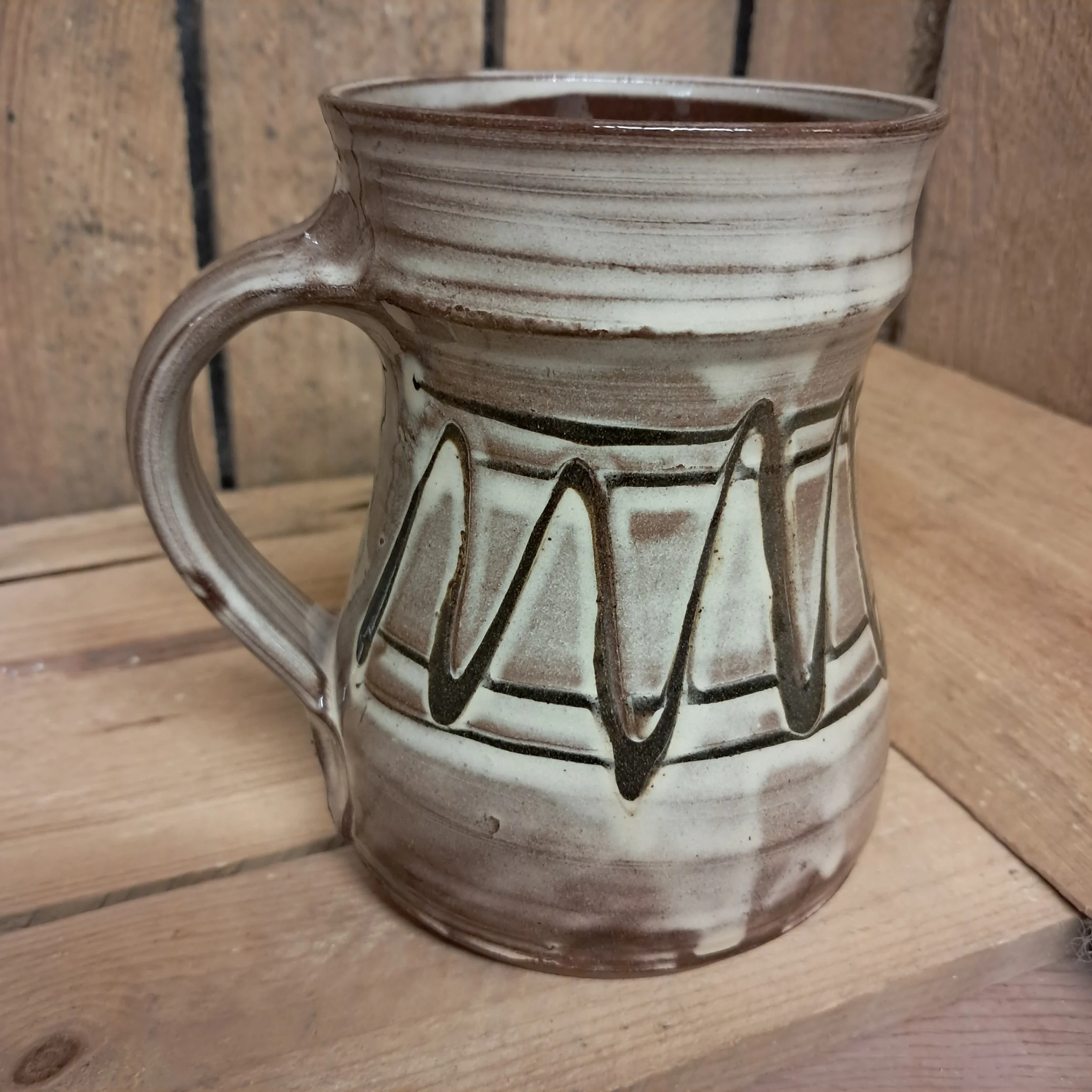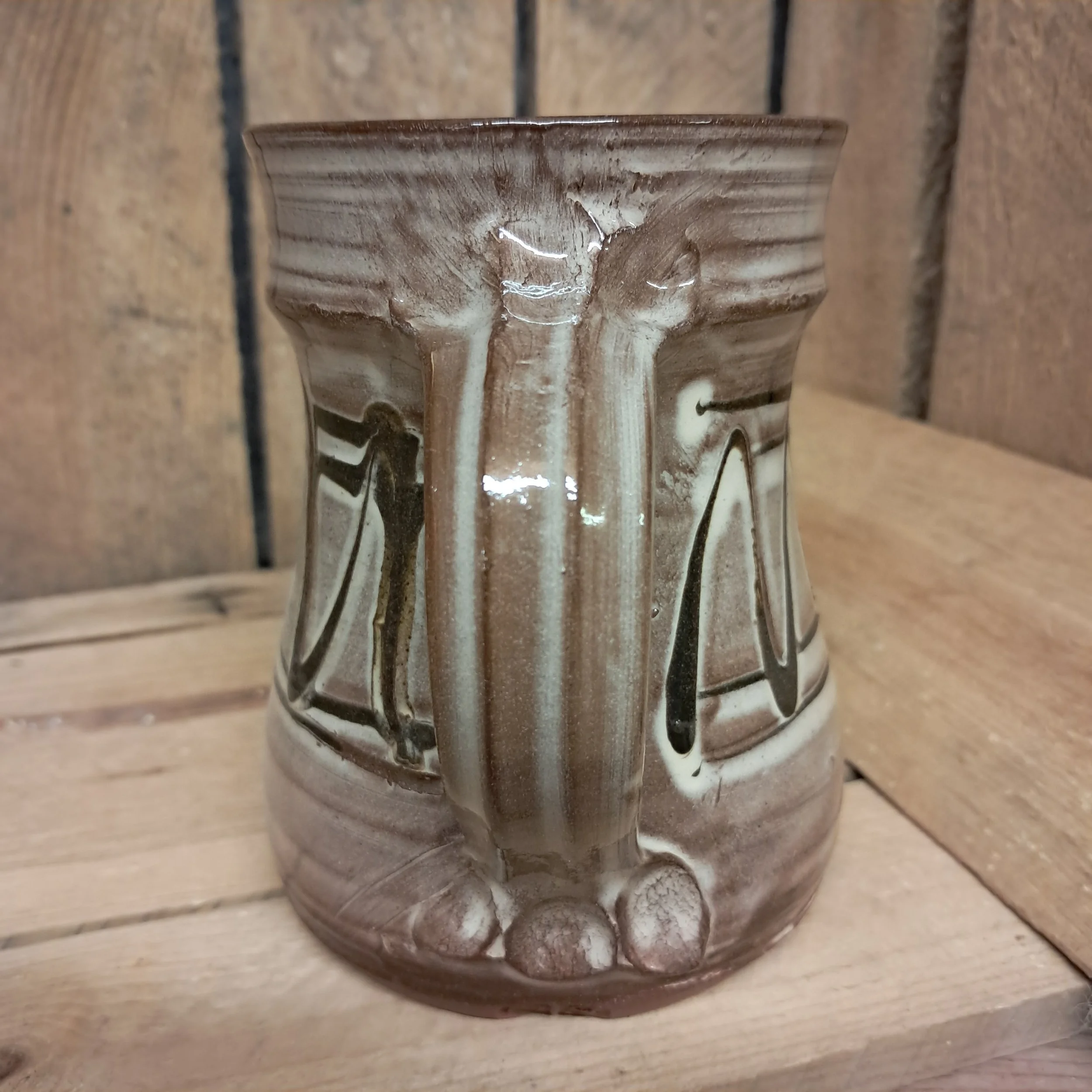 Image 1 of 3 Image 2 of 3 Image 3 of 3 Small Tankard - 12cm tall. £35.00 Small Tankard - 12cm tall.Cream with black slip trailed decoration. Add To Cart Added! Small Tankard - 12cm tall.Cream with black slip trailed decoration.