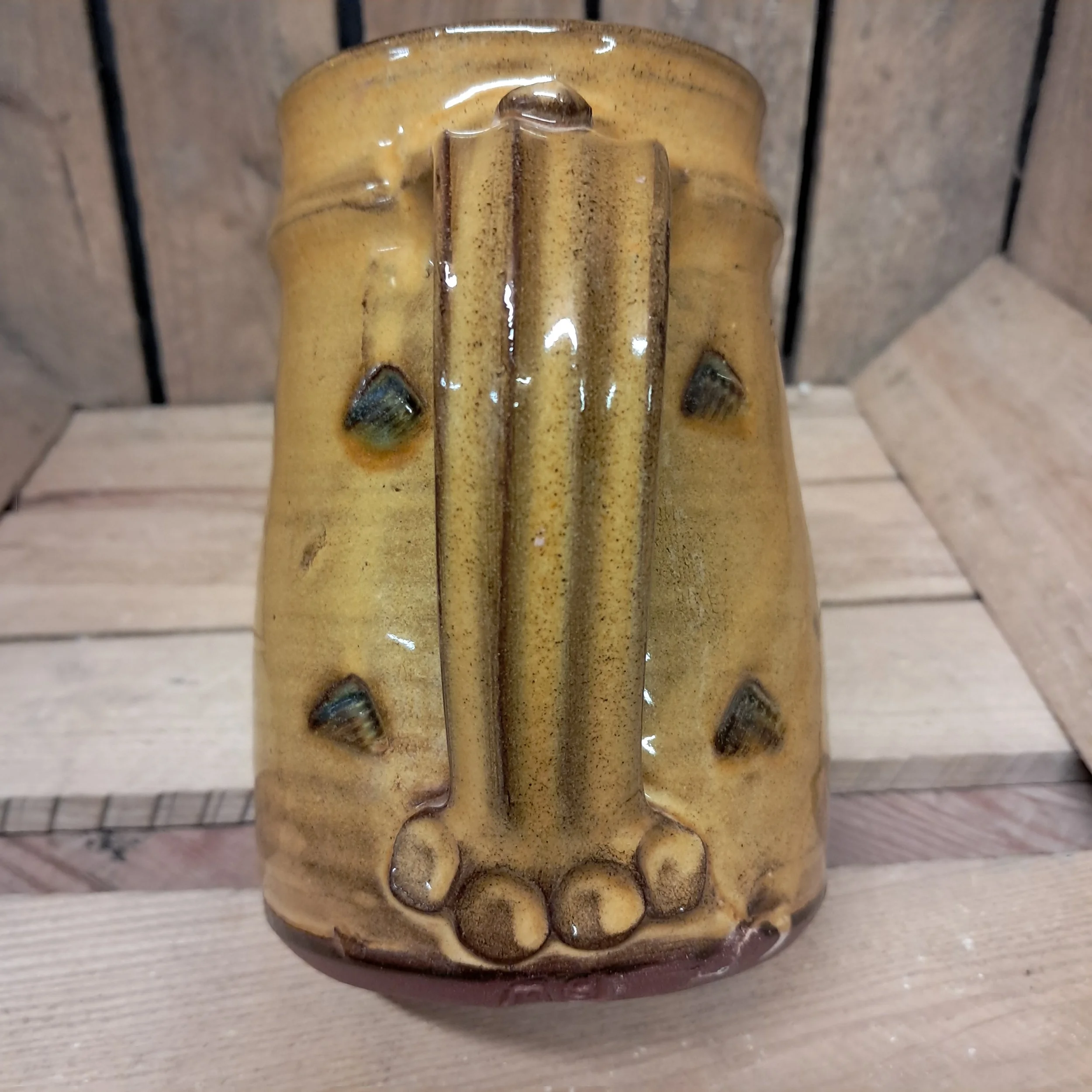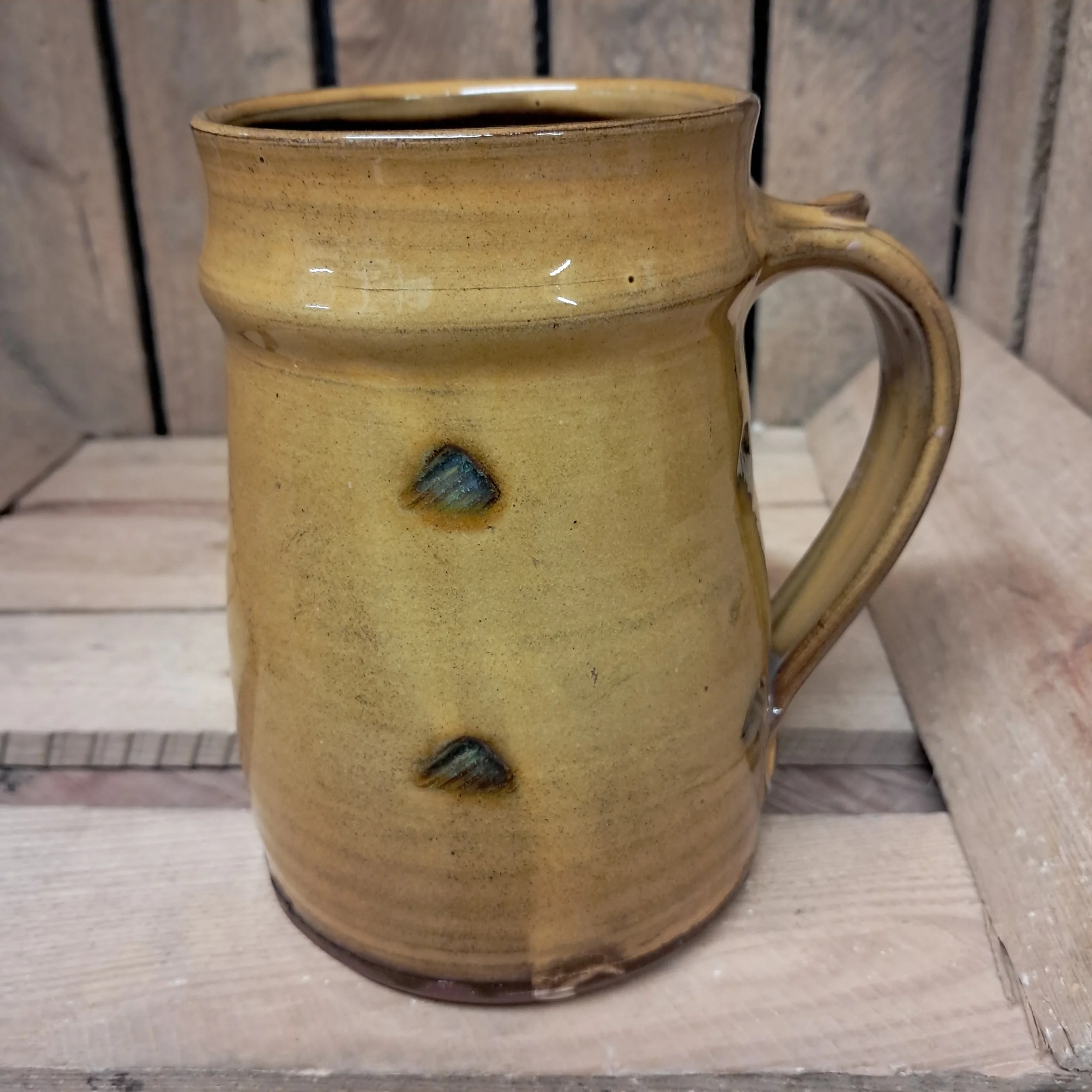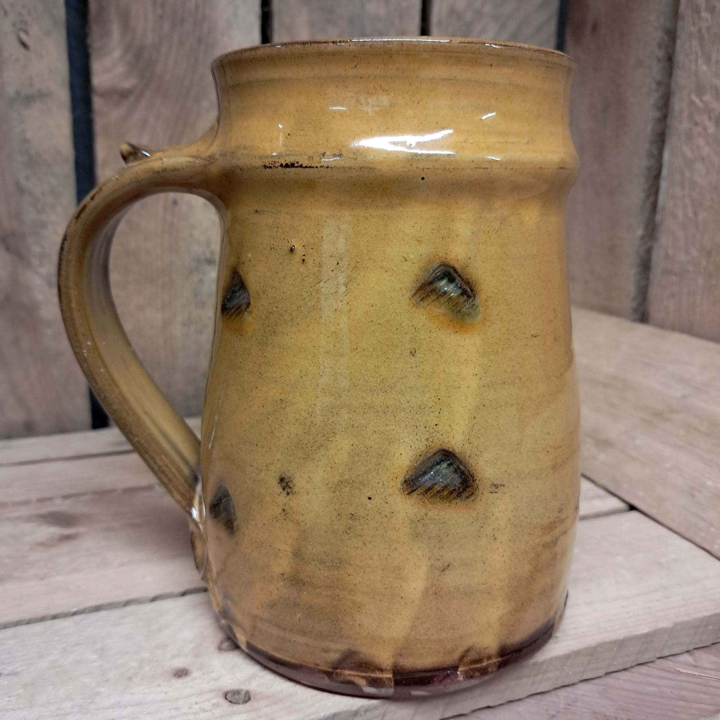 Image 1 of 4 Image 2 of 4 Image 3 of 4 Image 4 of 4 Tankard - 15cm tall. £50.00 Tankard - 14cm tall.Stamped decoration in an amber glaze.Holds approximately 1 pint. Add To Cart Added! Tankard - 14cm tall.Stamped decoration in an amber glaze.Holds approximately 1 pint.
