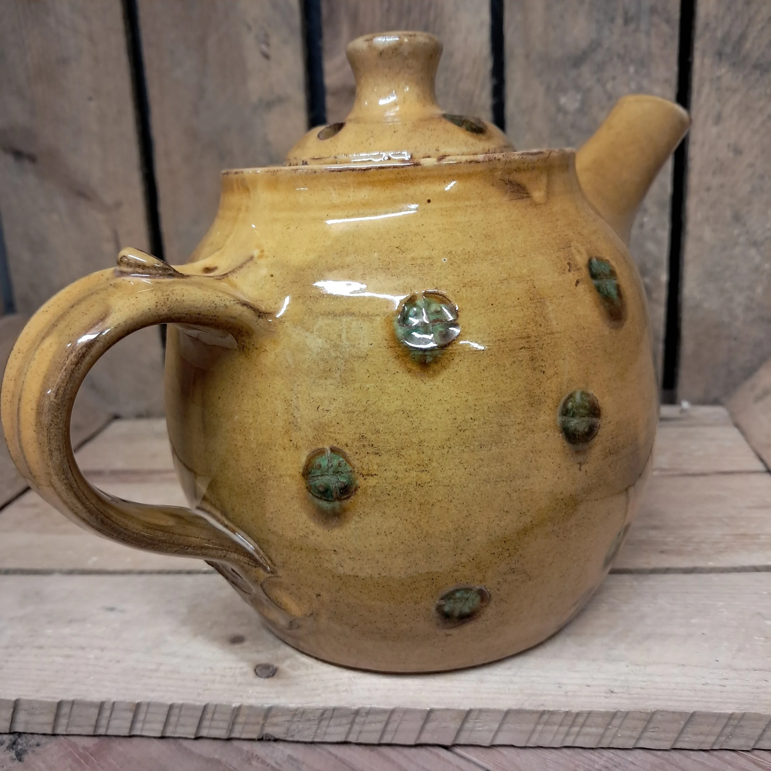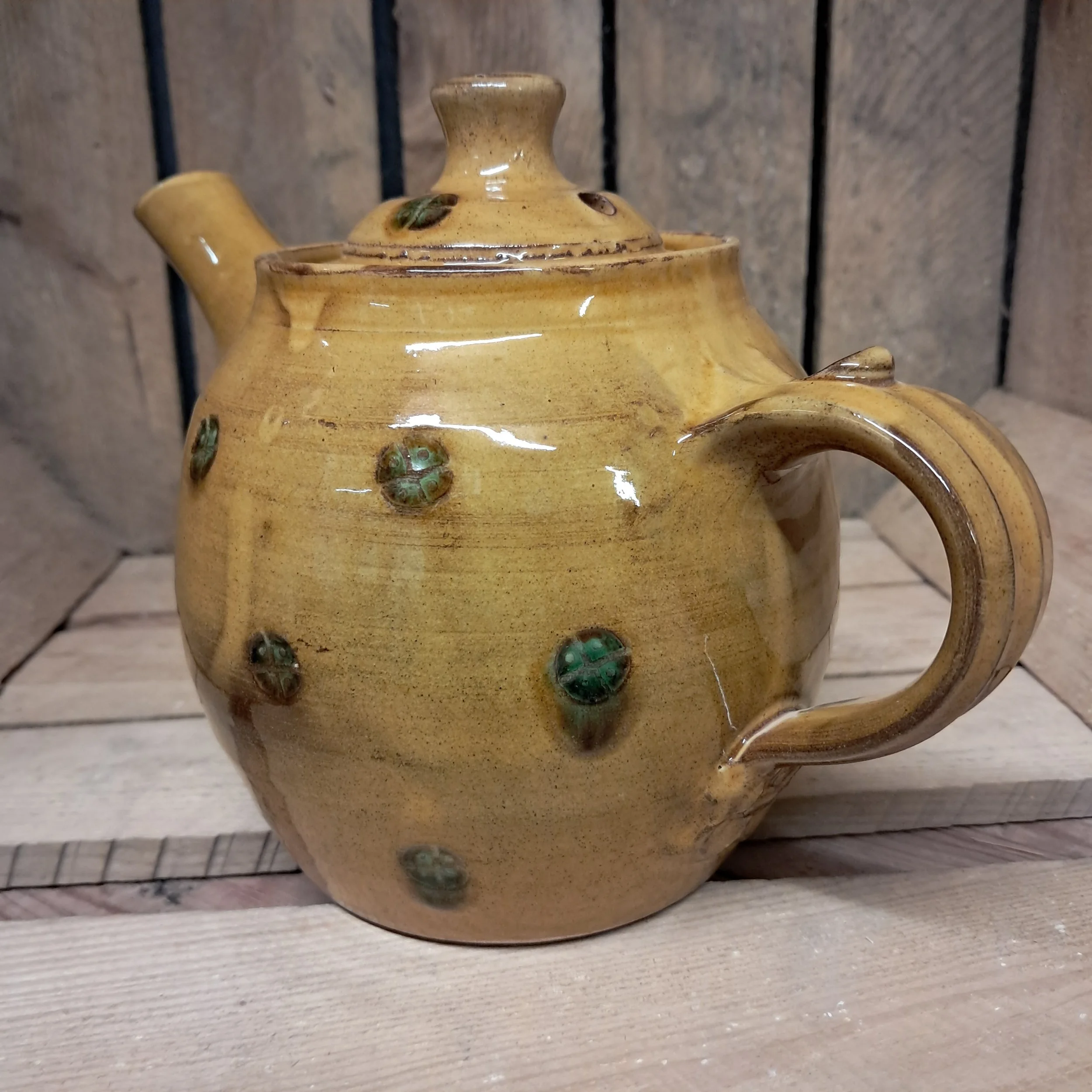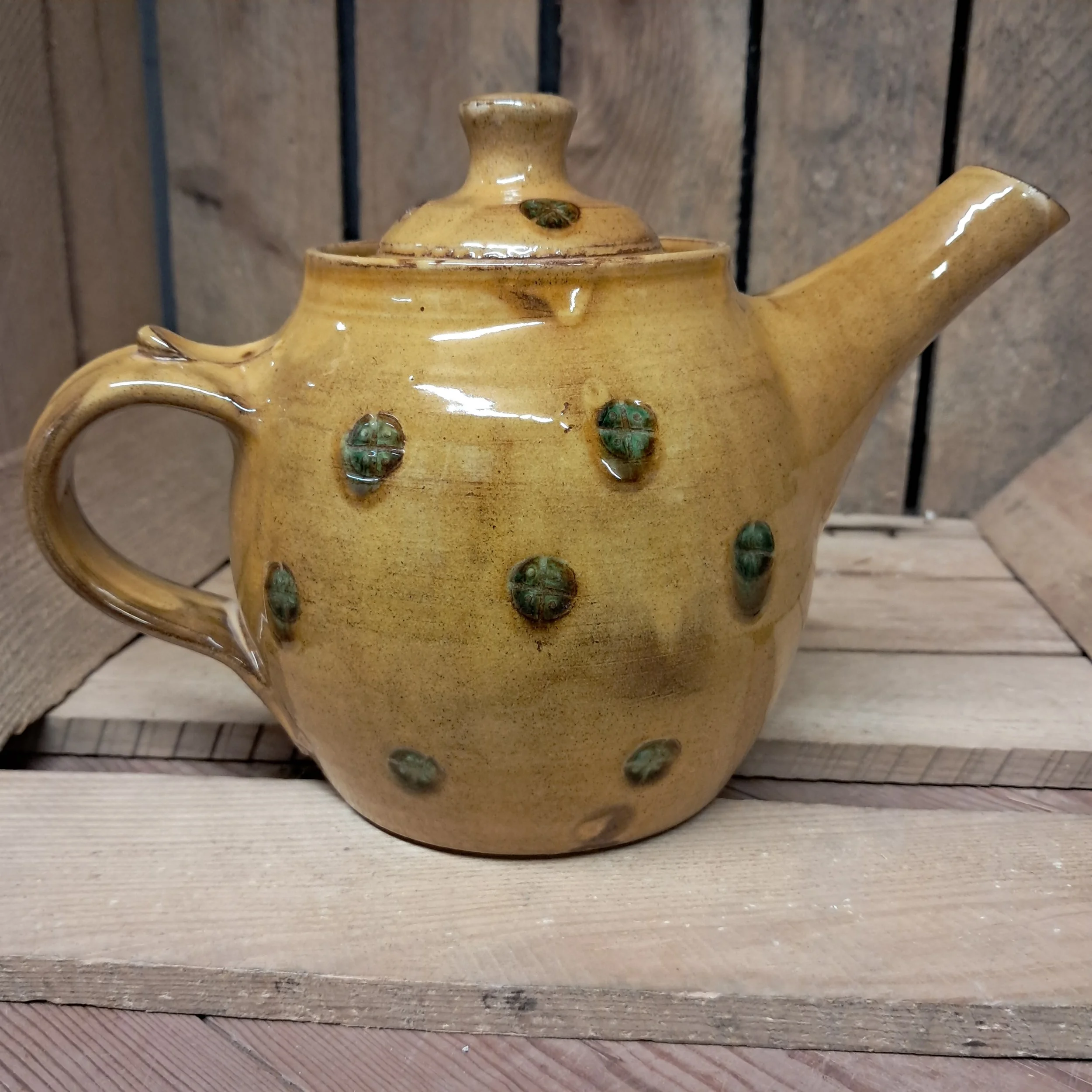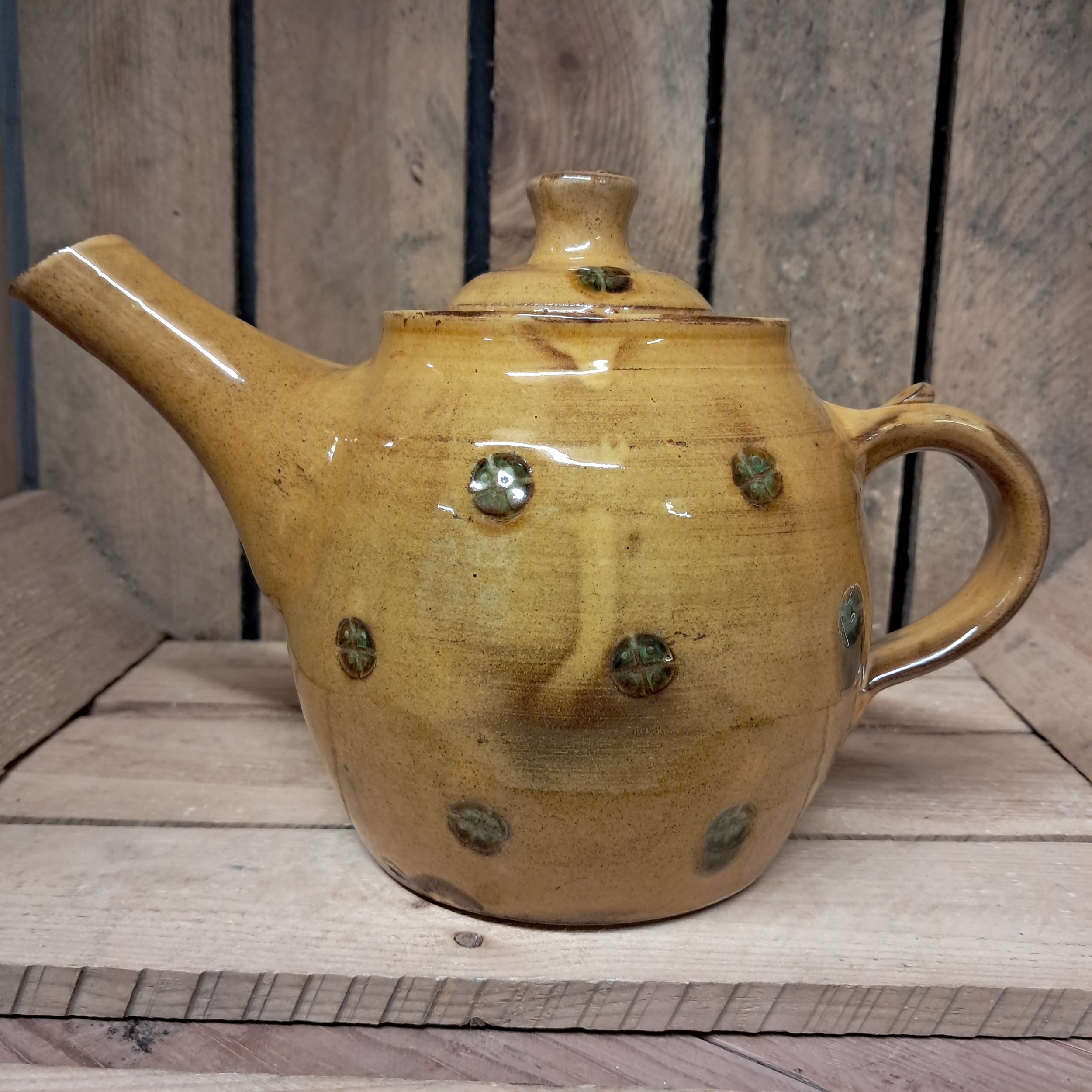 Image 1 of 4 Image 2 of 4 Image 3 of 4 Image 4 of 4 Teapot - 1 1/2 pint capacity. £110.00 Teapot - 1 1/2 pint capacity.16cm tall including lid.Stamped decoration in amber and green glaze finish. Add To Cart Added! Teapot - 1 1/2 pint capacity.16cm tall including lid.Stamped decoration in amber and green glaze finish.