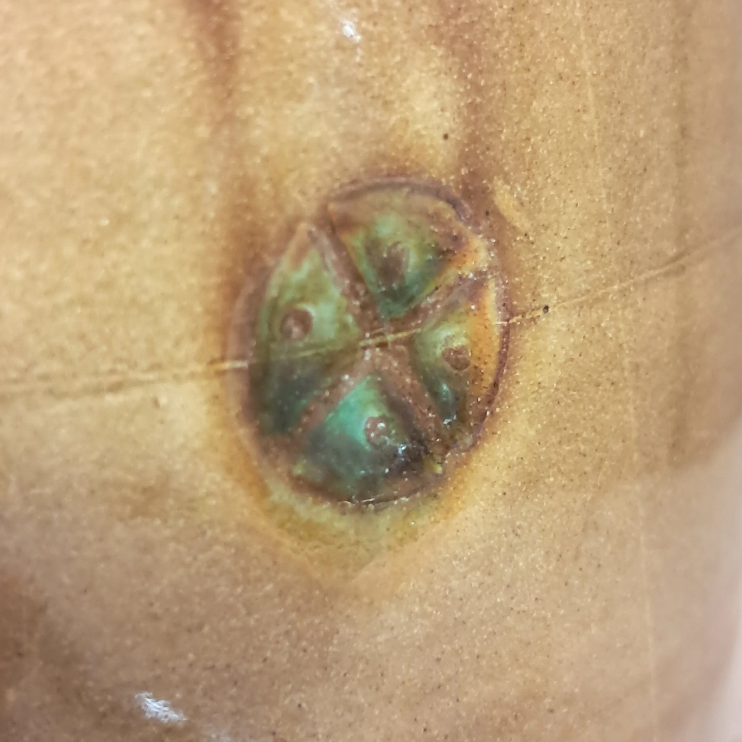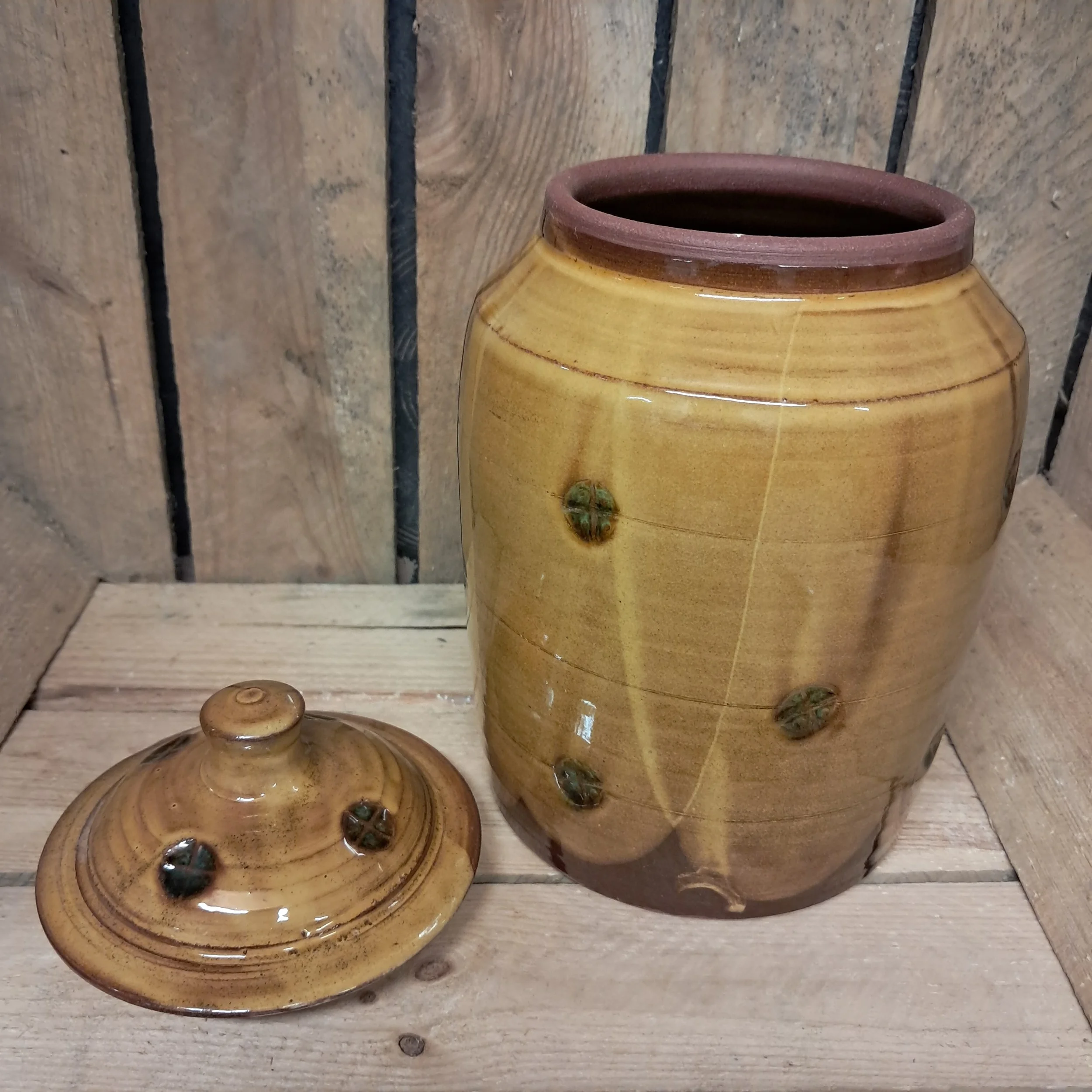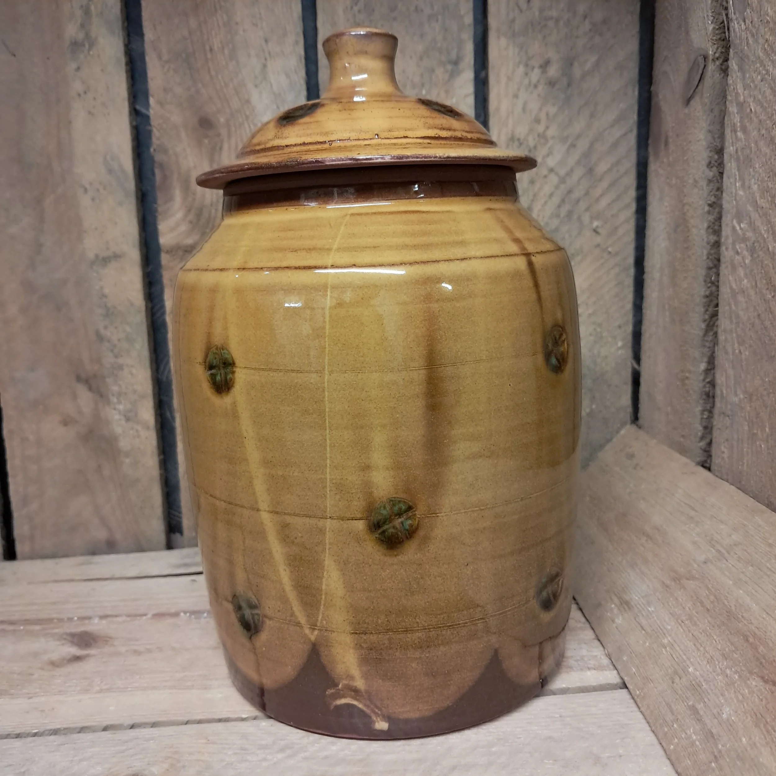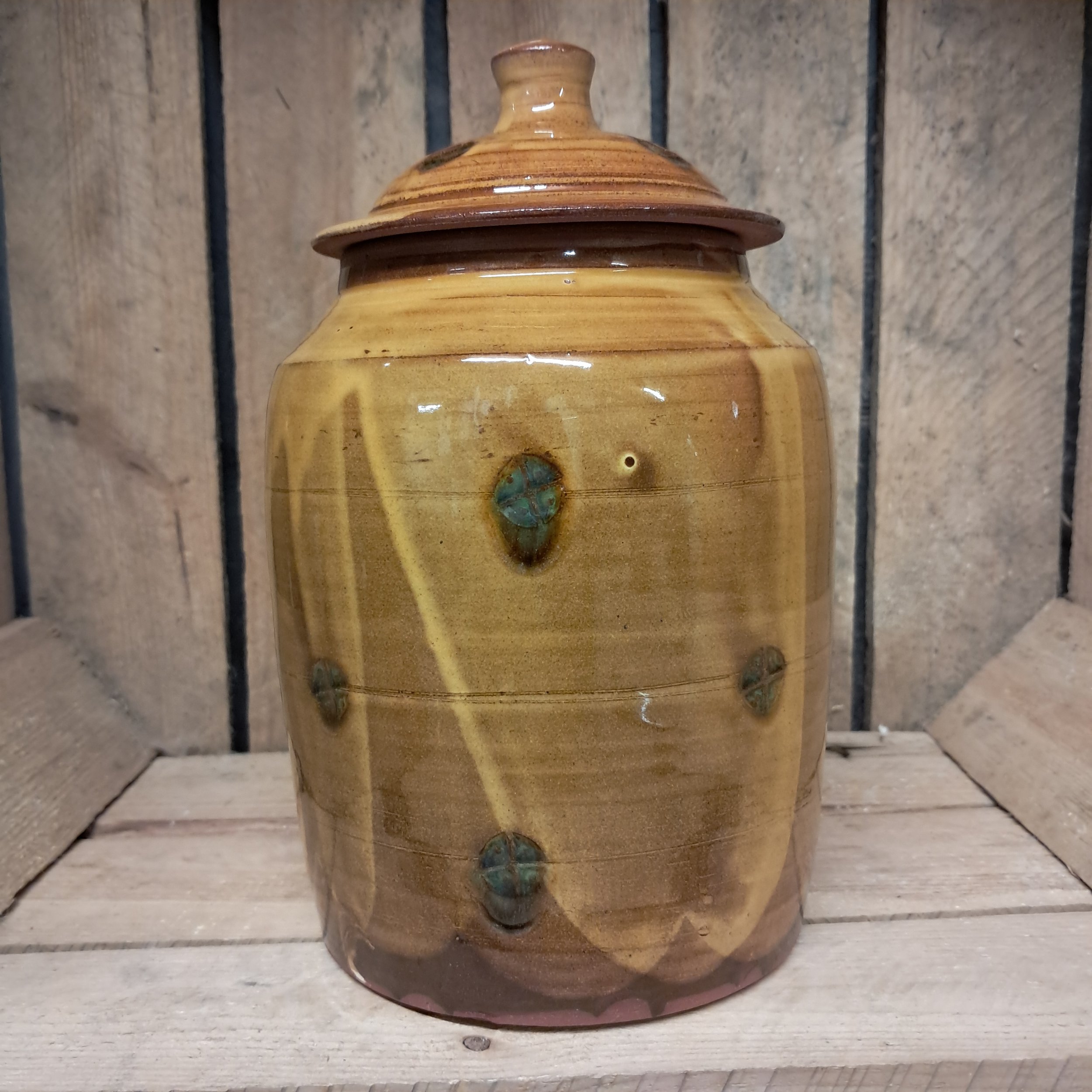Image 1 of 4 Image 2 of 4 Image 3 of 4 Image 4 of 4 Lidded Jar - 22cm tall. £95.00 Lidded Jar - 22cm tall including lid.Amber with stamped and green glaze highlights. Add To Cart Added! Lidded Jar - 22cm tall including lid.Amber with stamped and green glaze highlights.