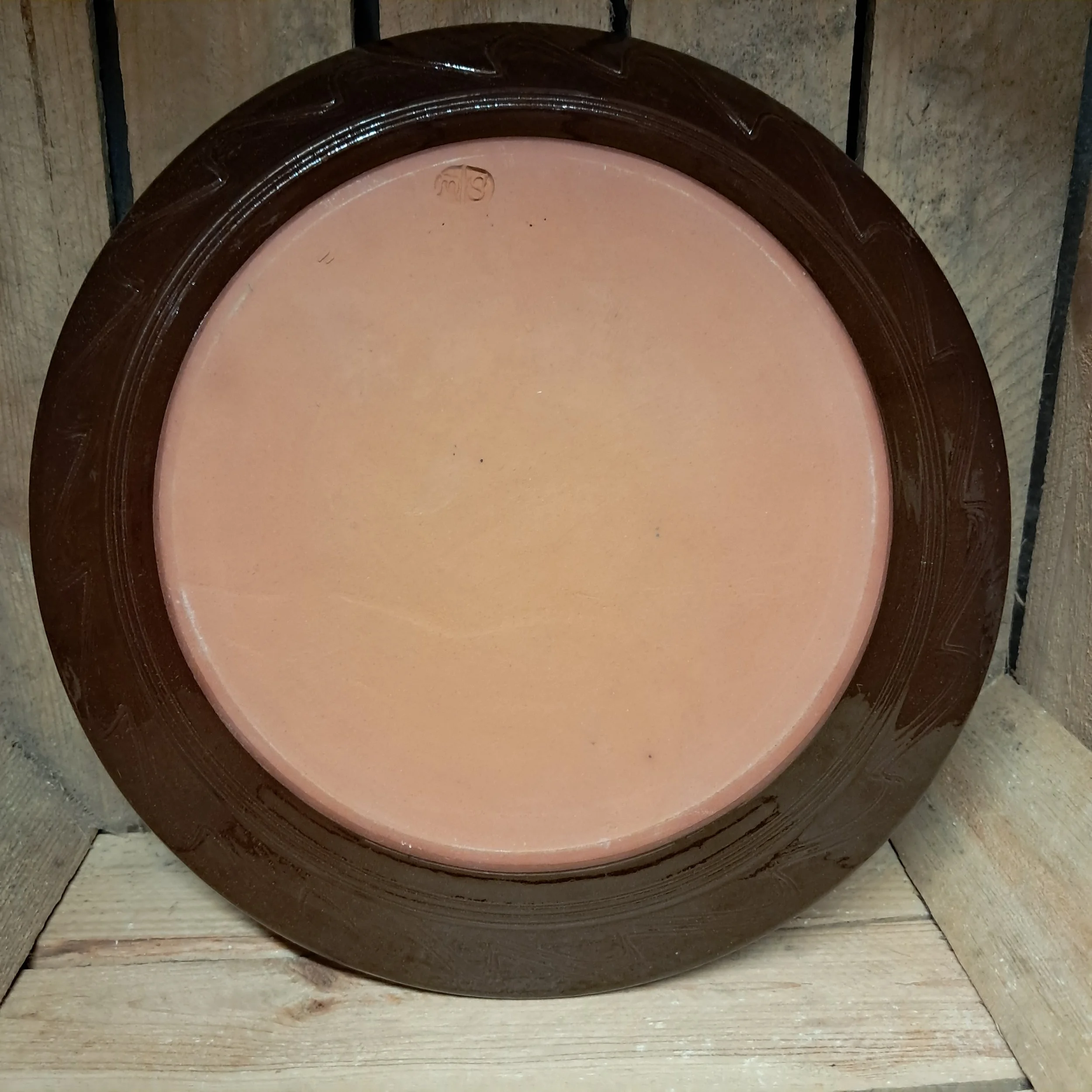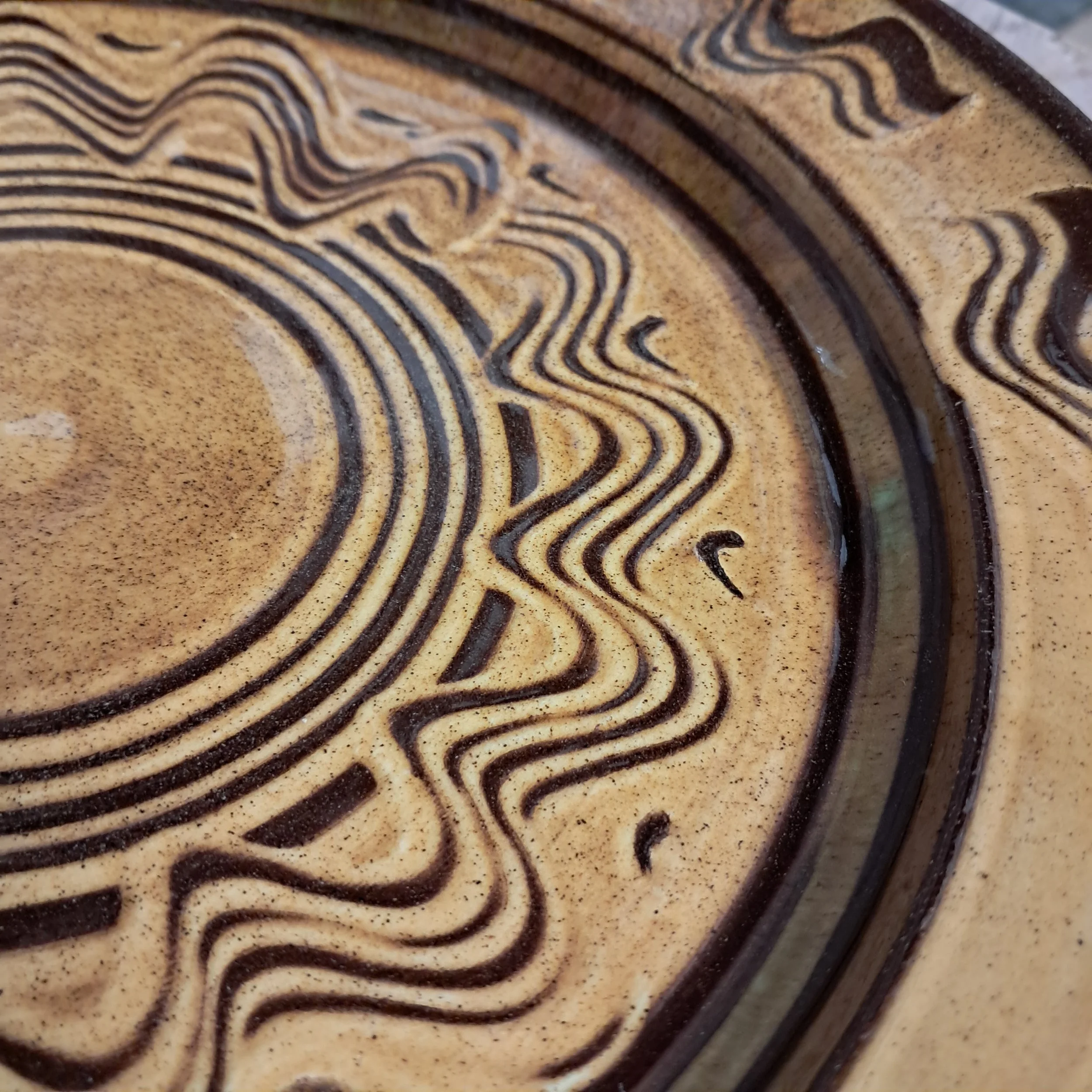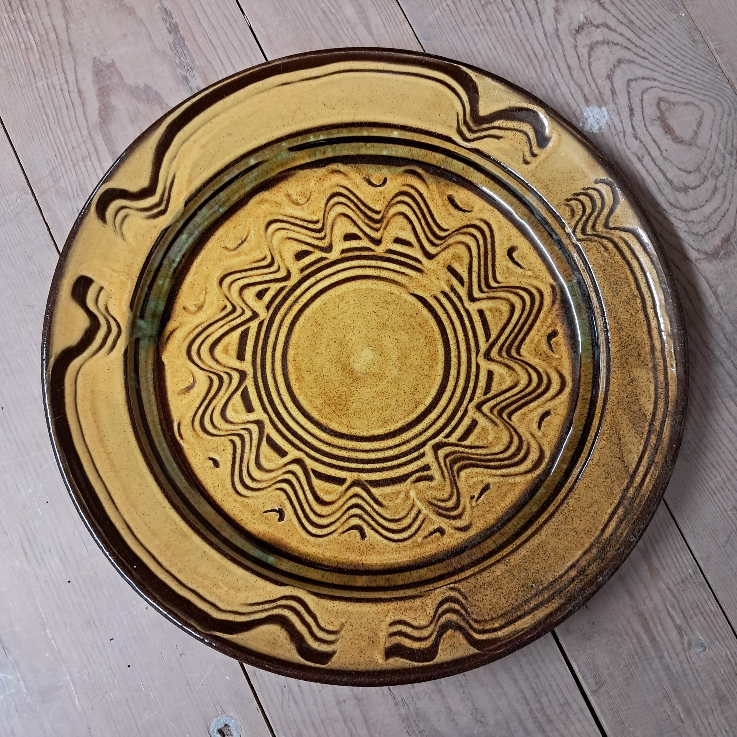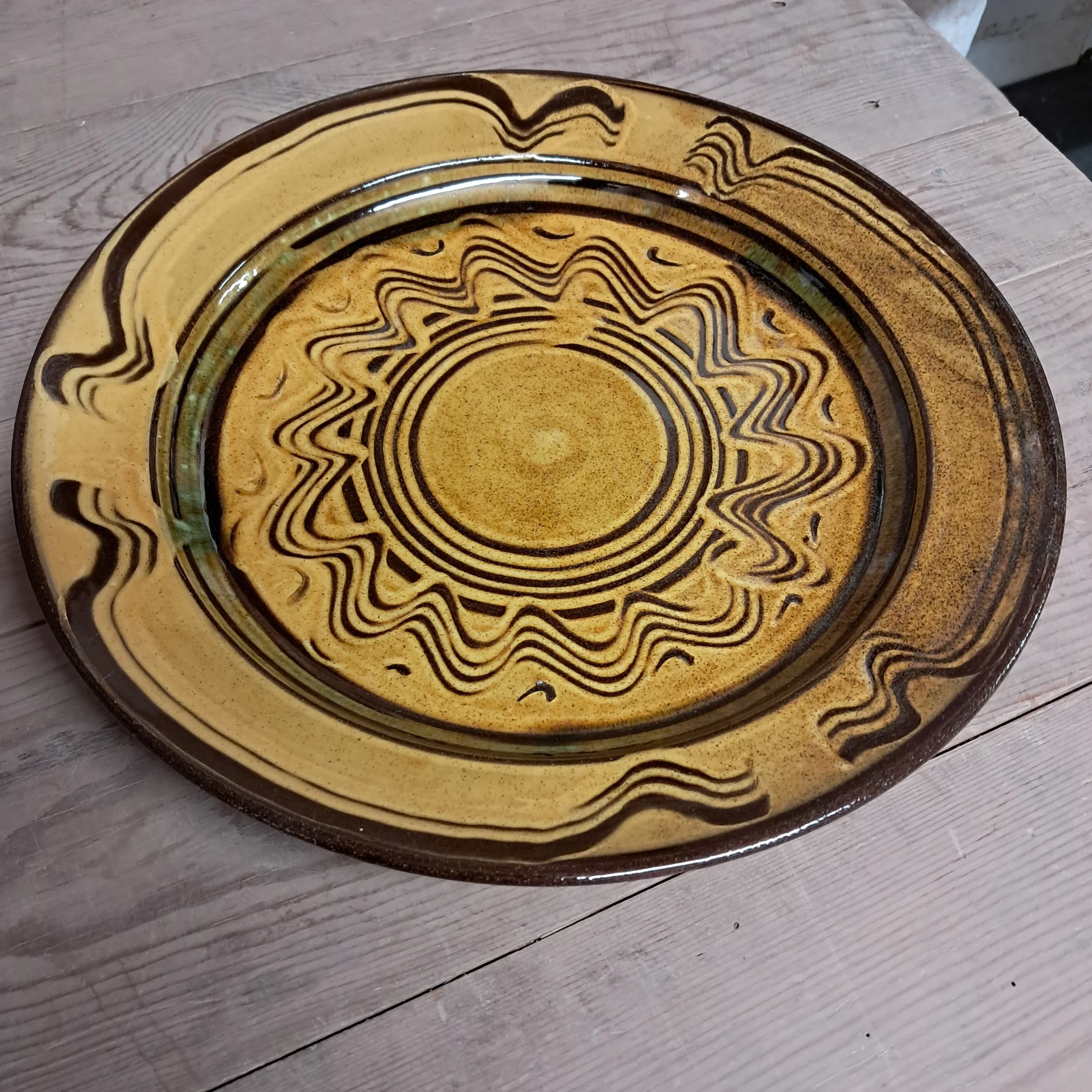 Image 1 of 4 Image 2 of 4 Image 3 of 4 Image 4 of 4 Plate - 28cm wide. £65.00 Plate -28cm wide.Combed slip decoration with amber and green glazes. Add To Cart Added! Plate -28cm wide.Combed slip decoration with amber and green glazes.